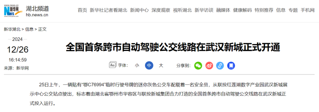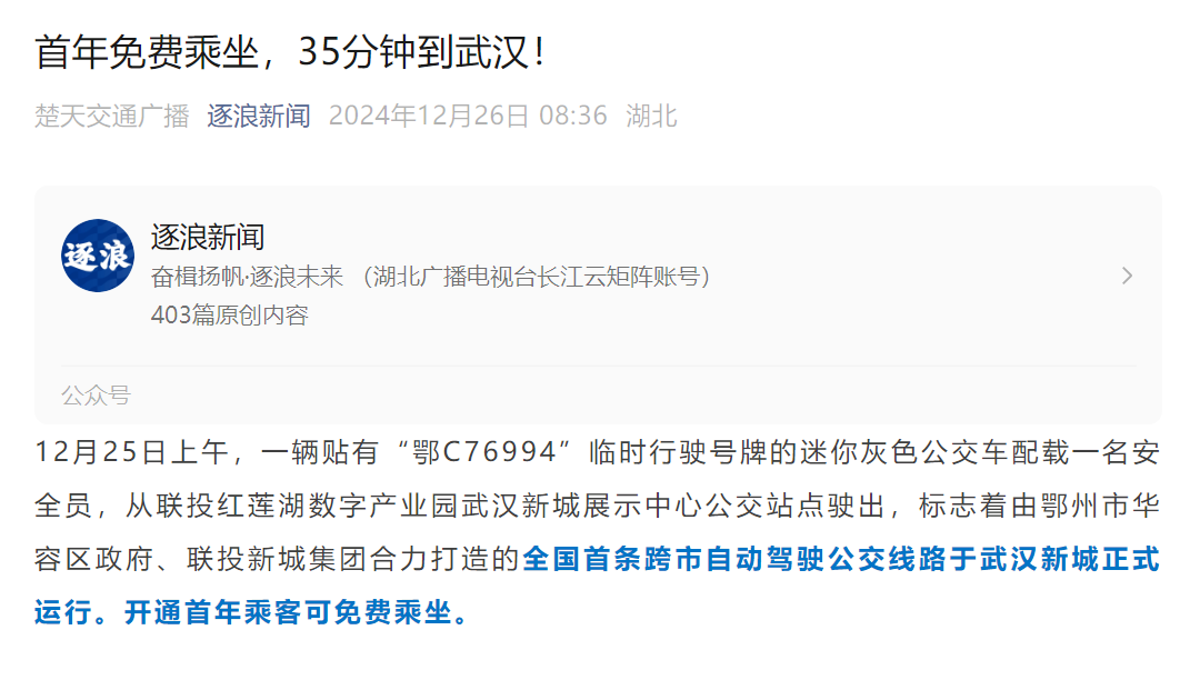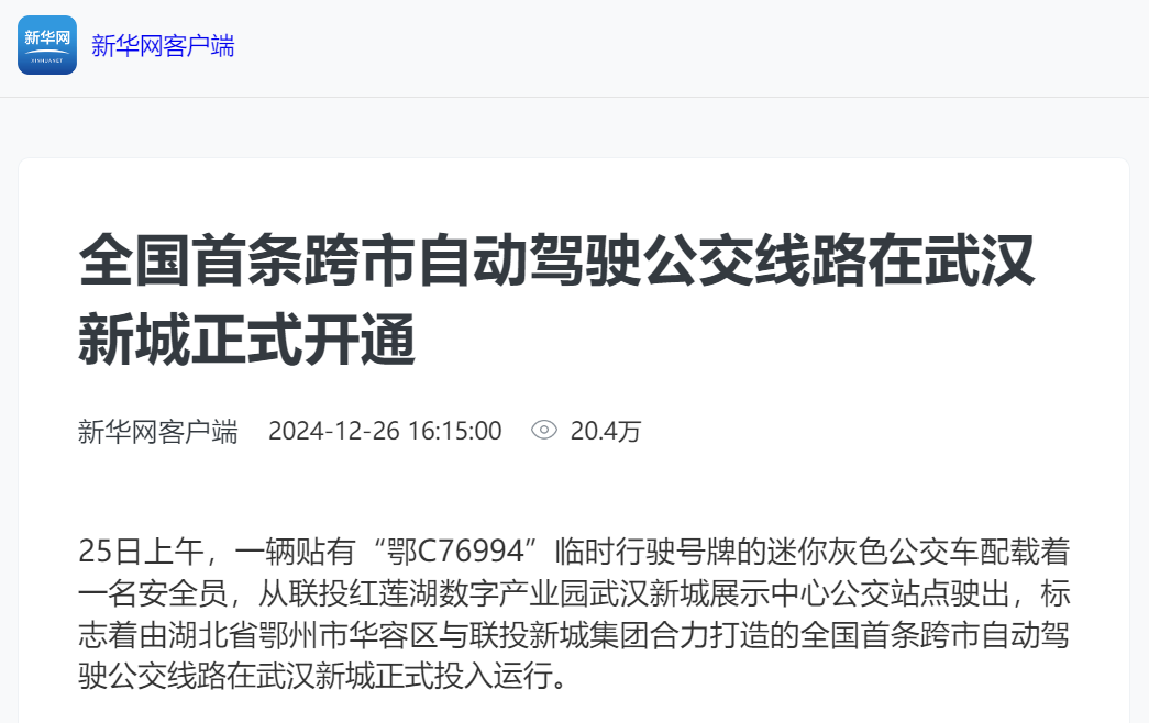 12月25日上午,由湖北省鄂州市華容區(qū)與聯(lián)投新城集團合力打造的全國首條跨市自動駕駛公交線路開通。眾多中央、省市媒體及政府官方宣傳平臺聚焦報道,24小時內(nèi)曝光量超百萬,共同見證聯(lián)投紅蓮湖數(shù)字產(chǎn)業(yè)園在科技驅動下邁向智慧出行新時代的堅實步伐。