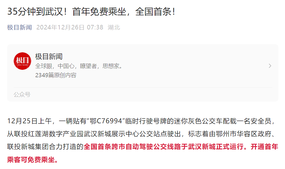 12月25日上午,一輛貼有“鄂C76994”臨時行駛號牌的迷你灰色公交車配載著一名安全員,從聯(lián)投紅蓮湖數(shù)字產(chǎn)業(yè)園武漢新城展示中心公交站點駛出,標志著由湖北省鄂州市華容區(qū)與聯(lián)投新城集團合力打造的全國首條跨市自動駕駛公交線路在武漢新城正式投入運行。