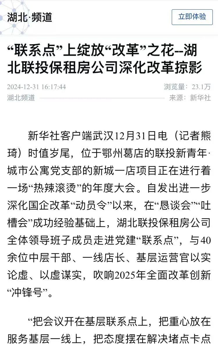 近日,新華社湖北頻道對聯(lián)投省保租房公司以高質(zhì)量黨建助力深化改革經(jīng)驗(yàn)進(jìn)行了聚焦報道,把基層黨建“聯(lián)系點(diǎn)”變?yōu)榉?wù)基層“連心點(diǎn)”的綜合改革思路成為報道關(guān)注的亮點(diǎn)。