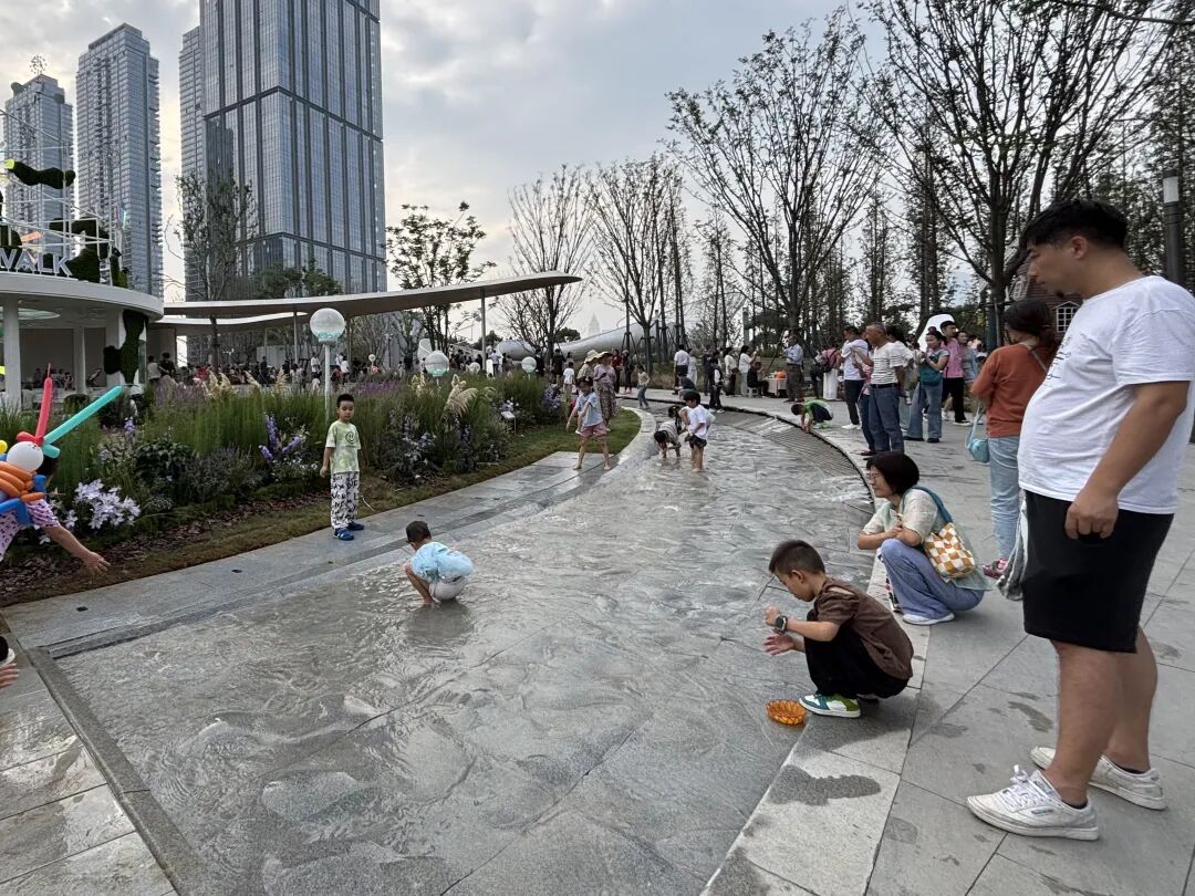 在武漢濱江天街戶外綠地公園,孩子們赤腳在水中嬉戲,歡笑聲不絕于耳。欒嘉雯 攝