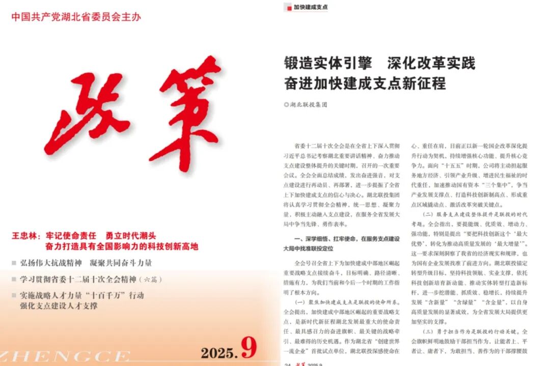近日,中國共產(chǎn)黨湖北省委員會(huì)主辦刊物《政策》2025年第9期刊發(fā)了《鍛造實(shí)體引擎 深化改革實(shí)踐 湖北聯(lián)投奮進(jìn)加快建成支點(diǎn)新征程》,以下為全文內(nèi)容:
