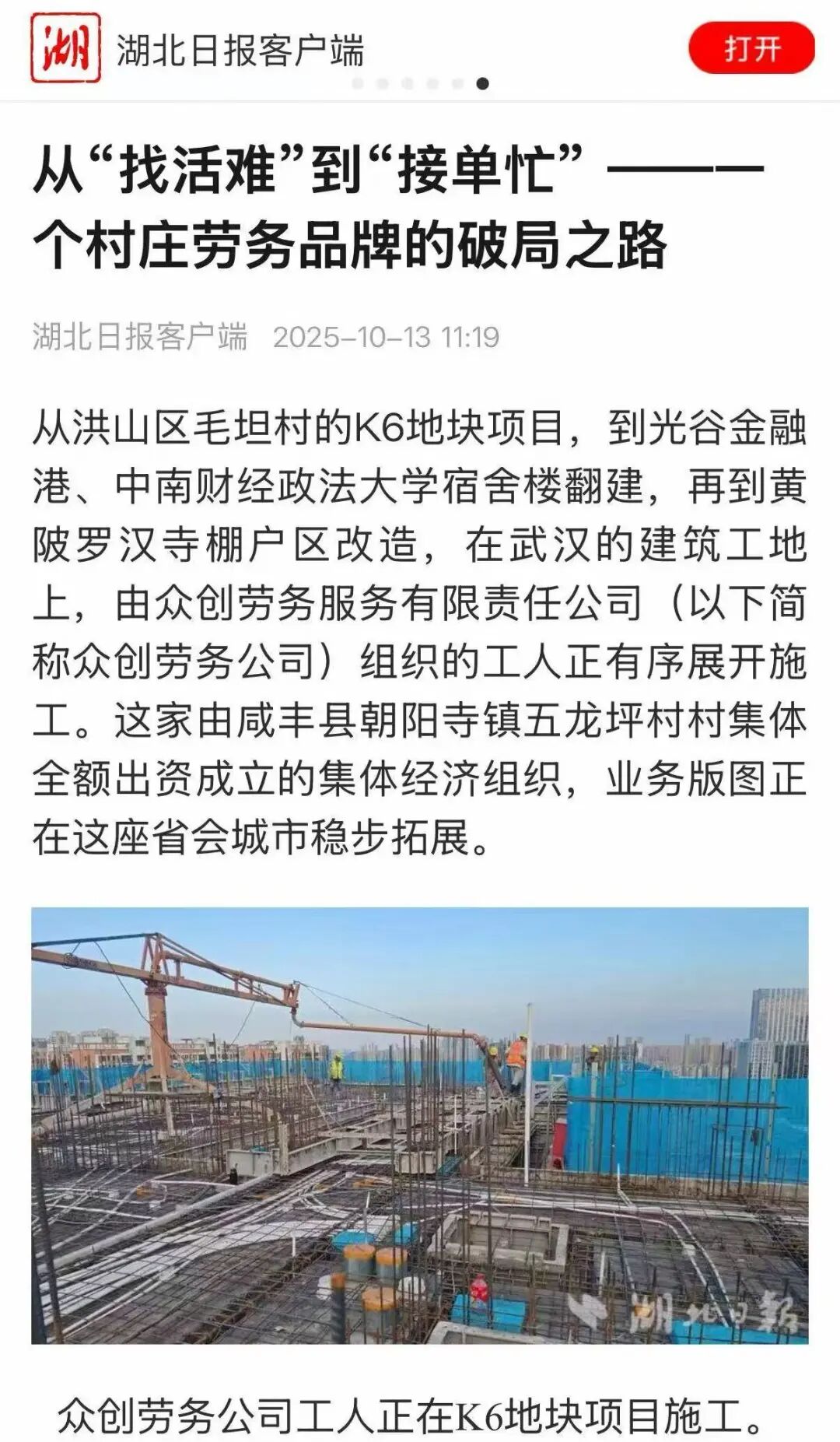 從洪山區(qū)毛坦村的K6地塊項(xiàng)目,到光谷金融港、中南財(cái)經(jīng)政法大學(xué)宿舍樓翻建,再到黃陂羅漢寺棚戶區(qū)改造,在武漢的建筑工地上,由眾創(chuàng)勞務(wù)服務(wù)有限責(zé)任公司(以下簡(jiǎn)稱眾創(chuàng)勞務(wù)公司)組織的工人正有序展開施工。這家由咸豐縣朝陽(yáng)寺鎮(zhèn)五龍坪村村集體全額出資成立的集體經(jīng)濟(jì)組織,業(yè)務(wù)版圖正在這座省會(huì)城市穩(wěn)步拓展。