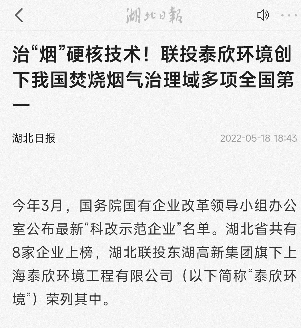 今年3月,國(guó)務(wù)院國(guó)有企業(yè)改革領(lǐng)導(dǎo)小組辦公室公布最新“科改示范企業(yè)”名單。湖北省共有8家企業(yè)上榜,東湖高新集團(tuán)旗下上海泰欣環(huán)境工程有限公司(以下簡(jiǎn)稱(chēng)“泰欣環(huán)境”)榮列其中。